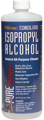 Tech Grade 99.9% Ultra Pure Isopropyl Alcohol is an excellent general all-purpose electronics cleaner for a wide range of technical applications and sensitive surfaces. Safe on plastics and other sensitive materials, PURETRONICS® Tech Grade Isopropyl Alcohol has moderate evaporation rate, leaves zero residue and is non-corrosive and ozone friendly. Recommended for removing flux residue, light oils, polar soils, oxide particles and other contaminants where optimum surface cleanliness is desired.