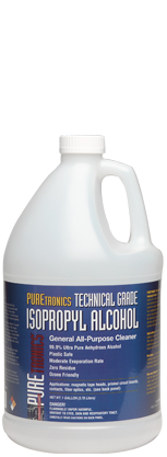 Tech Grade 99.9% Ultra Pure Isopropyl Alcohol is an excellent general all-purpose electronics cleaner for a wide range of technical applications and sensitive surfaces. Safe on plastics and other sensitive materials, PURETRONICS® Tech Grade Isopropyl Alcohol has moderate evaporation rate, leaves zero residue and is non-corrosive and ozone friendly. Recommended for removing flux residue, light oils, polar soils, oxide particles and other contaminants where optimum surface cleanliness is desired.